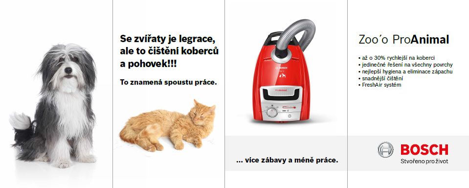 V souvislosti s uvedením nové řady vysavačů Zoo’o ProAnimal proběhne v květnu a červnu v nákupních centrech vybraných měst v celé České republice i na Slovensku speciální promo tour na malé domácí spotřebiče značky Bosch. Promo aktivity budou založeny na konceptu tzv. rozšířené reality s využitím domácích mazlíčků. Tzv. rozšířená realita – technologie, díky níž se do reálného světa pomocí počítačové technologie doplňuje realita další, umožní každému návštěvníkovi nákupního centra, aby si ve speciálním promo stánku Bosch hrál, hladil si nebo se dokonce fotil s fiktivními domácími mazlíčky. Do světa malých domácích spotřebičů Bosch tak bude vytvořen animovaný svět domácí mazlíčků, který bude všechny kolem bavit.