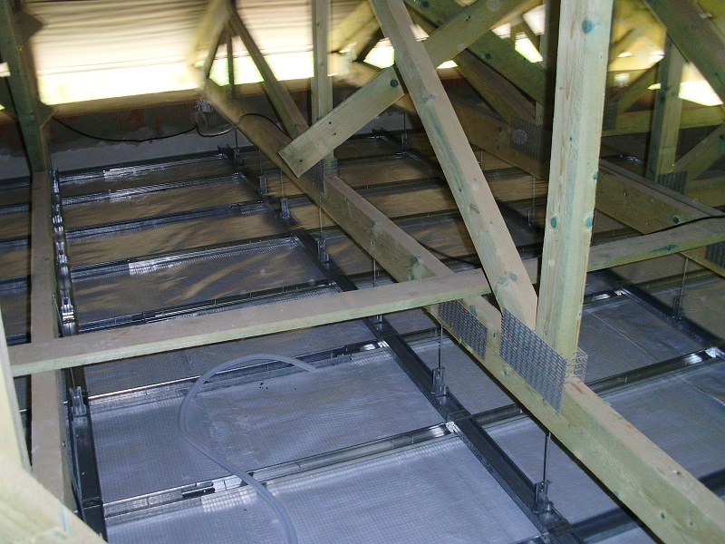 Podobný nepřístupný prostor je mezi stropem a podlahou u trámových stropů. V tomto případě není nutné vyklízet celou půdu a trhat podlahu po celé ploše izolovaného prostoru. Postačí vytvořit otvor mezi trámy a tepelná izolace se nafouká do celého prostoru. V půdních vestavbách, obložených dřevěných štítech a všude kde jsou dutiny v konstrukcích domů, navrhne společnost ABD Izospol postup prací, vytvoření otvorů a uvedení objektu do původního stavu. Mnoho zakázek k izolaci podkroví je například u dřevostaveb OKAL, které jsou izolované nedostatečně. Po dodatečné izolaci získají objekty daleko lepší užitné vlastnosti, s úsporou nákladů na vytápění.
