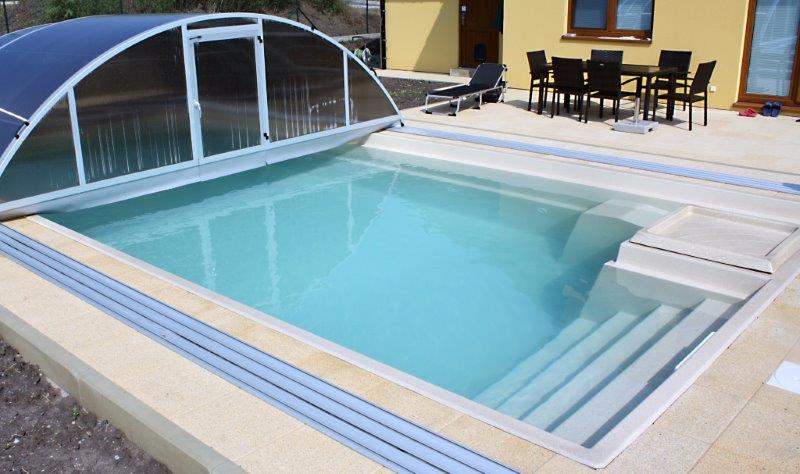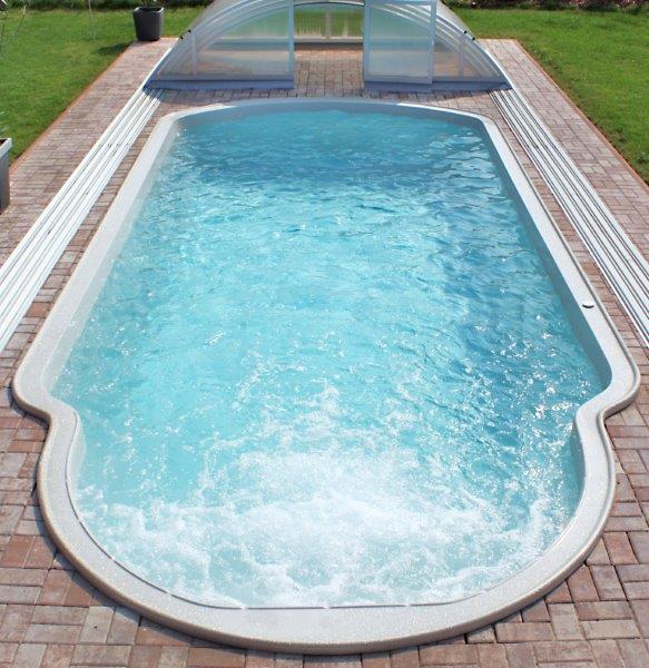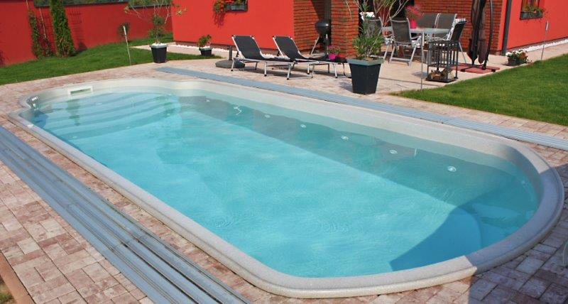 Bazény se dodávají vždy již vybavené všemi požadovanými komponenty, takže se zabudovávají snadno a rychle. Granitová povrchová úprava je vysoce odolná proti chlorované vodě a lze si podle vkusu vybrat z mnoha barevných provedení. Obvykle se konstrukce zasypává suchým betonem, bazén se přitom současně napouští vodou, přičemž výška vodní hladiny vždy musí být zhruba o 15-25cm v předstihu před výškou zásypu. Na závěr se provede úprava terénu.