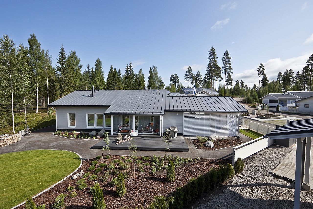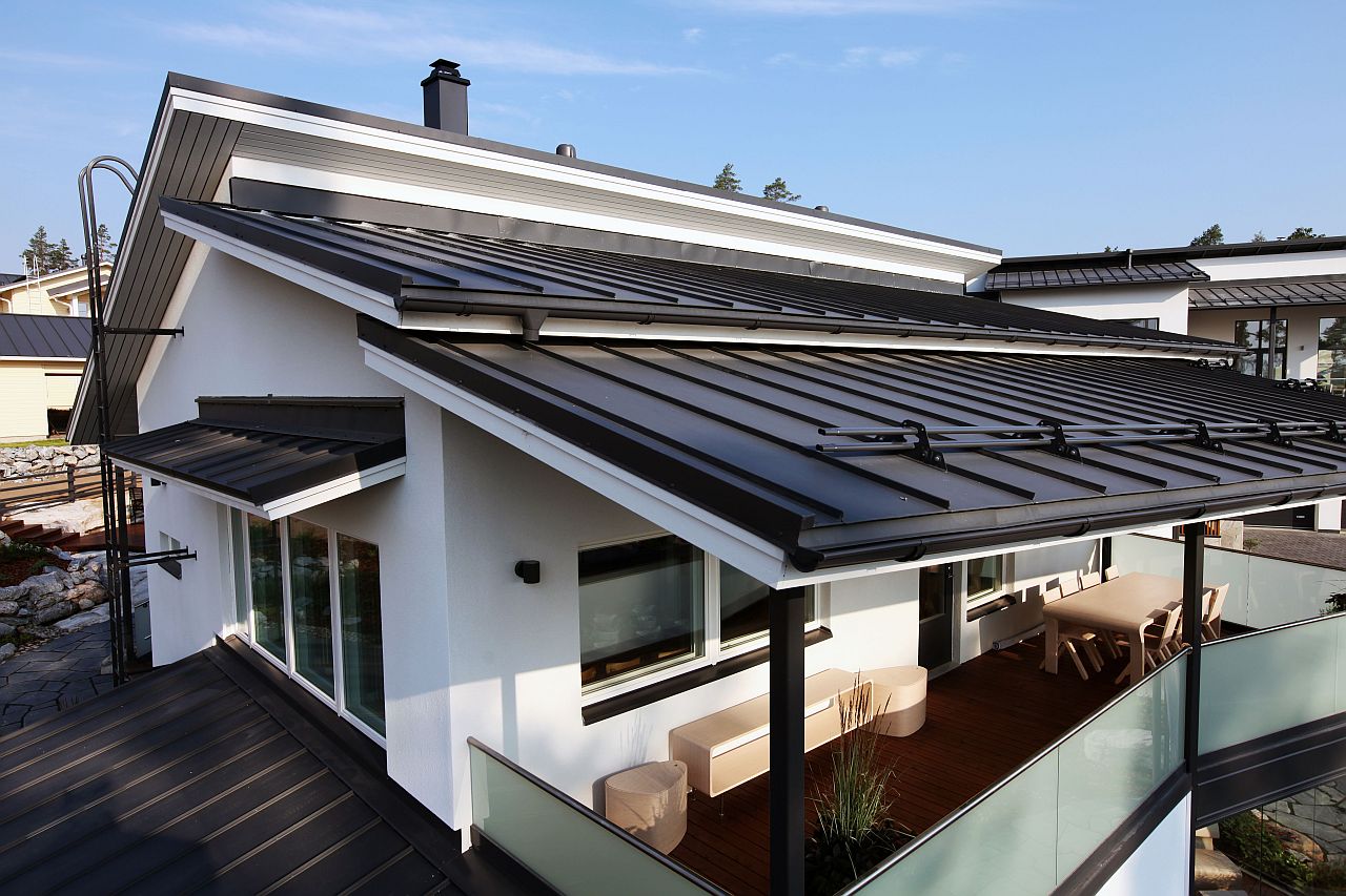 Designu vládne falcovaná krytina Ruukki Classic v černé úpravě Pural Matt ( se zárukou 50 let ), která se hodí na moderní stylové domy stejně jako na horskou nebo lesní chatu. Spíše do městské zástavby zapadnou krytiny se strukturou tašek jako je Ruukki Finnera nebo Monterrey.