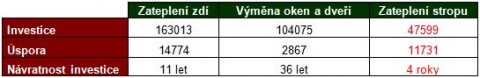 První tabulka vám jednoznačně ukazuje, jaké jsou celkové náklady na jednotlivé typy zateplení domu a jaká je jejich návratnost. Vidíte, že nejlépe vychází izolace stropu, jak na cenu, tak návratnost v letech. Izolace fasády vám udělá také velkou úsporu, což vidíte i v celkovém porovnání v procentech. Ale bohužel je to velmi nákladná položka v rodinném rozpočtu a ne každý si může takovou opravu dovolit. Zateplení stropu vám nabízí snadné, levné, efektivní a okamžité řešení.