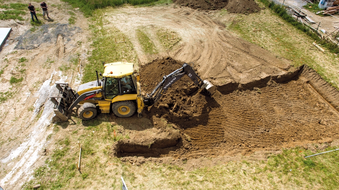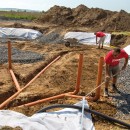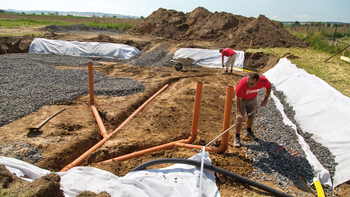 - Po provedení výkopových prací se na rostlý terén připraví drenáže, zdravotechnika a prostupy pro ostatní inženýrské sítě.