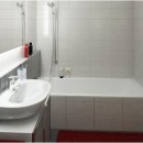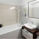 obklady a vybavení koupelen a WC: keramické obklady Lasselsberger, Unistone – bílá, béžová a další 3 varianty, umyvadlo a umývátko Jika Lyra plus, bílá, akrylátová vana Kaldewei, akrylátová sprchová vanička Jika Olymp, bílá, chromované pákové baterie Hansa Pico, závěsné WC Jika Lyra plus, příprava pro pračku, otopný žebřík Korado,