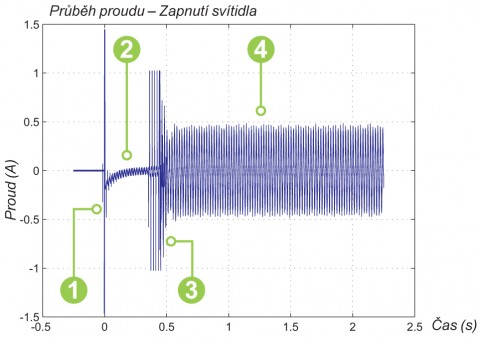 U LED svítidel je nárazový proud (Obr. 1, část 1) roven až 250násobku jmenovitého proudu. Příčinou je nabíjení kompenzačních kondenzátorů v napájecím zdroji. Tato přechodová špička je kratší než 1 milisekundu (ms). Je-li svítidlo zapnuto při úhlu napětí 90° (v tomto případě, je napětí na své maximální hodnotě 325 V pro síť 230 AC) je tato proudová špička nejvyšší. Při zapnutí při nulovém úhlu napětí, je nárazový proud mnohem nižší. Poté dochází k rozběhu předřadníku (následujících 100 ms až 1,5 s) a odebíraný proud je nižší než jmenovitý (Obr. 1, část 2). Při samotném zažehnutí LED modulu (Obr. 1, část 3) je odebíraný proud cca dvojnásobkem proudu jmenovitého.
