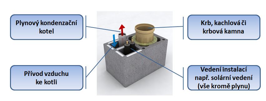 Hlavní podíl na vytápění domácností má zemní plyn a prozatím nic nenasvědčuje tomu, že by se to v budoucnu mělo radikálně změnit. Nicméně lidé stále častěji hledají k plynu alternativu nebo spíše doplněk. Důvodem jsou úspory, komfort, ale i strategické hledisko. V přímé reakci na tyto současné trendy ve vytápění přišla společnost Schiedel s komínovým systémem KombiGas, který v plné míře vyhovuje zvyšujícím se nárokům na energetickou soběstačnost ve výstavbě. V jednom komínovém tělese se proto nacházejí dva samostatné průduchy. První keramický komínový průduch je určený pro připojení spotřebiče na pevná paliva. Druhý plastový slouží k odvodu spalin od plynového kondenzačního kotle. Systém vedle odvodu spalin zajistí samozřejmě i přívod spalovacího vzduchu do plynového kotle. Součástí komínového tělesa je navíc další volná šachta, která může být využita například pro připojení solárních kolektorů. Instalací komínového systému KombiGas a využitím všech jeho benefitů můžete výrazně snížit závislost na primárních energiích, ke kterým se řadí plyn.