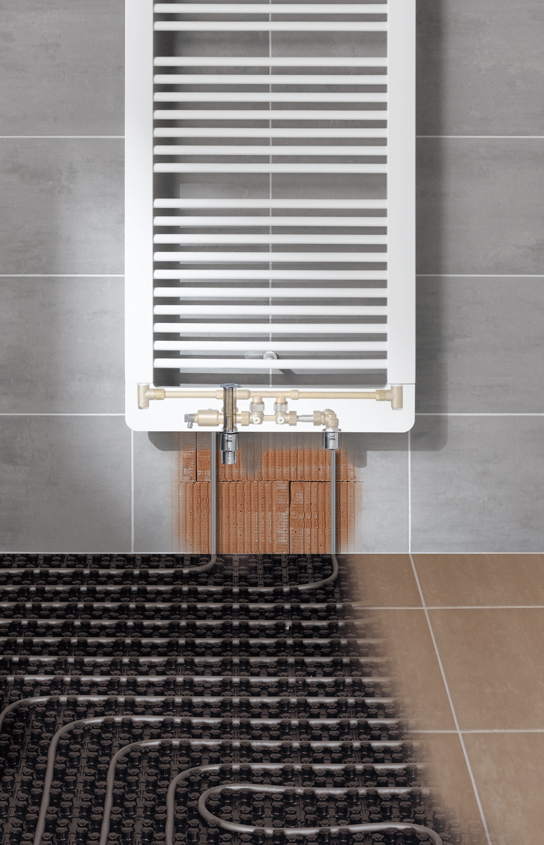 Napojení podlahového vytápění na existující rozvody pro radiátory je možné pomocí připojovací sady x-link dodávané pro vybrané designové radiátory Kermi. Připojovací sada je integrována pod krytem radiátoru a přebírá regulaci právě důležité teplotní hladiny radiátoru a podlahového vytápění. Zásah do topné soustavy není proto zapotřebí. Možnost oddělené regulace podlahového vytápění a radiátorů zůstává zachována. Design, popřípadě vzhled příslušných radiátorů není nijak narušen. Na kombinovaný provoz upozorňuje pouze přidaná regulační hlavice sloužící k regulaci podlahového vytápění.