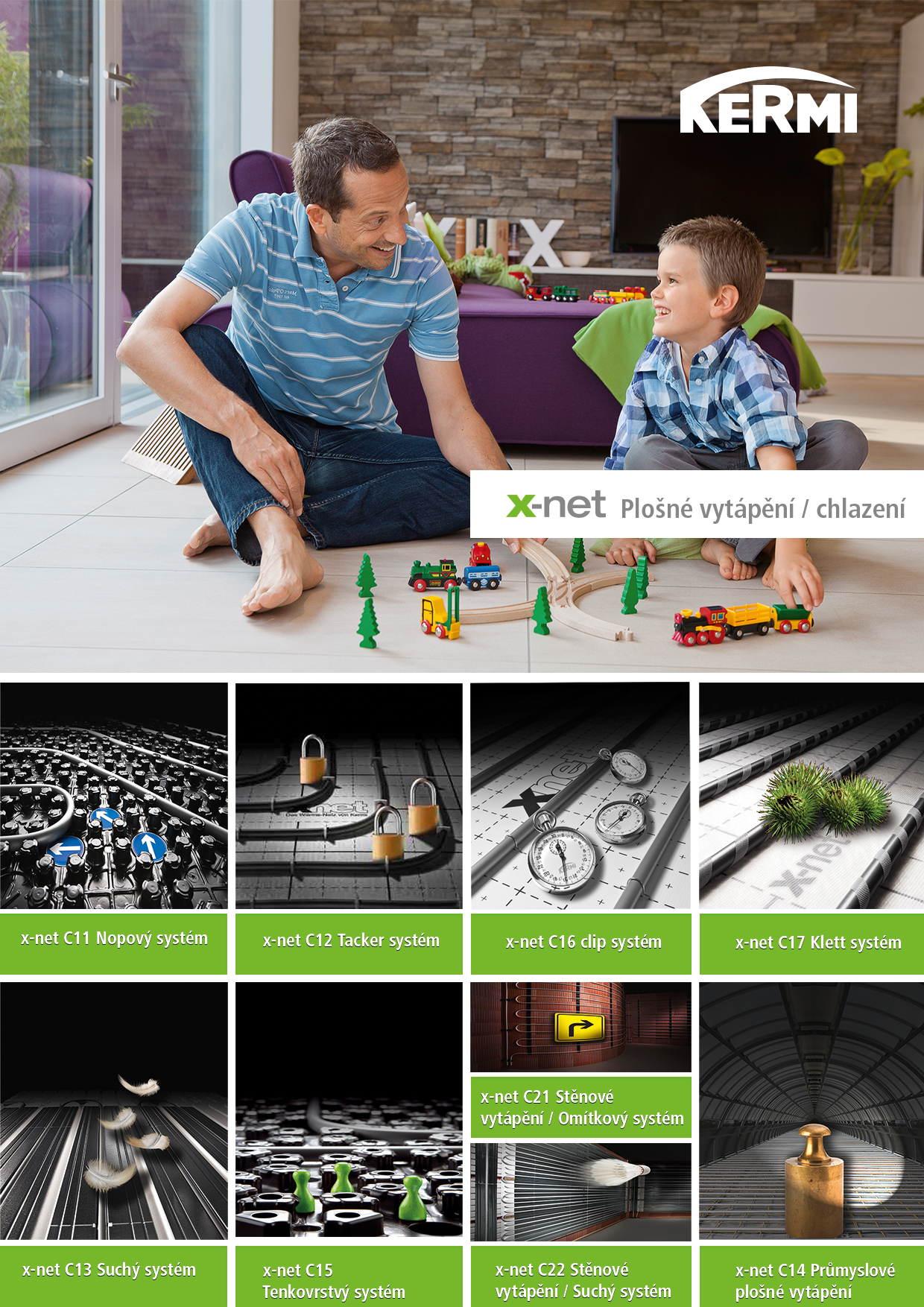Kermi, odborník v oblasti topné a sanitární techniky pro prostorové klima a sprchové kouty, poskytuje široký sortiment systému plošného vytápění/chlazení, které splňují všechny požadavky instalace jak při novostavbě, tak i při rekonstrukci nebo sanaci. S několika přídavnými komponenty lze různé systémy x-net využít i k ochlazování místností v letních měsících.