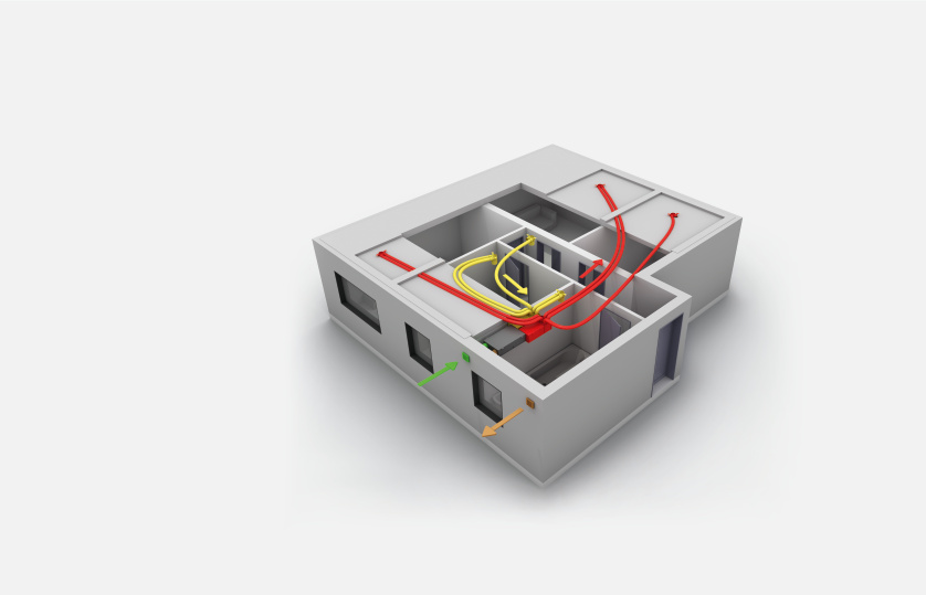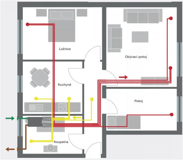 - Byt s rozlohou 96 m2: zelená – venkovní vzduch, červená – přiváděný vzduch, žlutá – odváděný vzduch, hnědá – odvětrávaný vzduch
