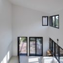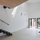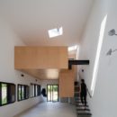 Prozatím si ale užívá volnosti nezastavěné místnosti, nad kterou se vznáší obytná část. Otevřený prostor přitom navazuje na venkovní dřevěnou terasu a zahradu. K příjemnému vyznění celého interiéru přispívá neutrální ladění dřevěných součástí, které rozčleňují prostor na čtyři různé výškové úrovně.