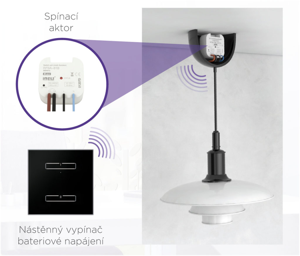 Řešení je jednoduché. Spotřebič (např. světlo) je se zdrojem elektrické energie spojeno prostřednictvím spínací jednotky – aktoru, který zajišťuje sepnutí nebo rozpojení elektrického okruhu, a tím také zapnutí nebo vypnutí spotřebiče. Tato jednotka je jakýmsi prostředníkem na elektrickém vedení a může být umístěna kdekoliv na jeho cestě. Například v rozvodné skříni vedle pojistek, nebo naopak přímo u spotřebiče. Třeba v krytu stropního lustru, pokud nebudete chtít, aby na něj bylo vidět. A tento spínací aktor již bezdrátově komunikuje s ovladačem.