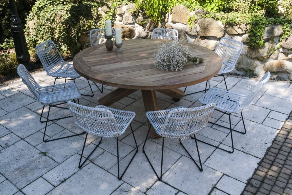 Nejdůležitějším elementem soupravy BORDEAUX je kulatý stůl s průměrem 170 cm. Tento působivý kousek vděčí za svou jedinečnost materiálu, ze kterého je vyroben – teakového dřeva. Exotický teak je na rozdíl od evropských druhů nasycený kyselinou křemičitou a přírodními oleji. Díky tomuto specifickému složení je toto dřevo neobyčejně tvrdé a odolné vůči vnějším vlivům (i silným chemickým prostředkům). Při jmenování plusů nesmíme zapomenout na jeho ohromující vzhled. Přirozenou nepravidelnou strukturu dřeva může časem pokrýt stříbřitý povlak, který dodá nábytku ušlechtilý ráz.